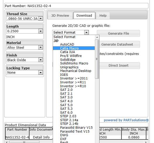 航空宇宙産業の設計プロセスの効率アップのため、AIAはCADENAS PARTsolutions社とIHSとパートナーシップを結ぶことになりました。このパートナシップのもと、PARTsolutions eCATALOGsolutionsツールがIHS Standards Expert®に統合され、NAS 3DカタログがPARTsolutionsパーツマネージメントソリューション内のカタログとして利用できるようになります。 本サービスはウェブベースのIHSソリューション内にて提供されます。エンジニアはツール上でネジ幅、長さ、材質、フィニッシュ、ロッキングタイプといったパラメーターを設定するだけで簡単にNAS、NASM、NA、NAMといったファスナー規格のCADモデルのダウンロードができます。